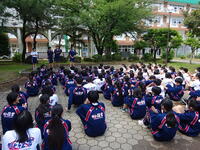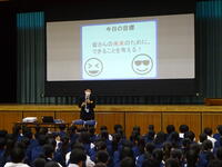 4月15日に、体育館で交通安全教室を行いました。今年は、JAFの方に来ていただき交通安全に関するお話をしていただきました。お話のタイトルは「皆さんの未来のために、できることを考えましょう」でした。特に中学生、高校生の自転車による事故が多く見られるということなので、くれぐれも事故にあわないように気を付けてもらいたいです。